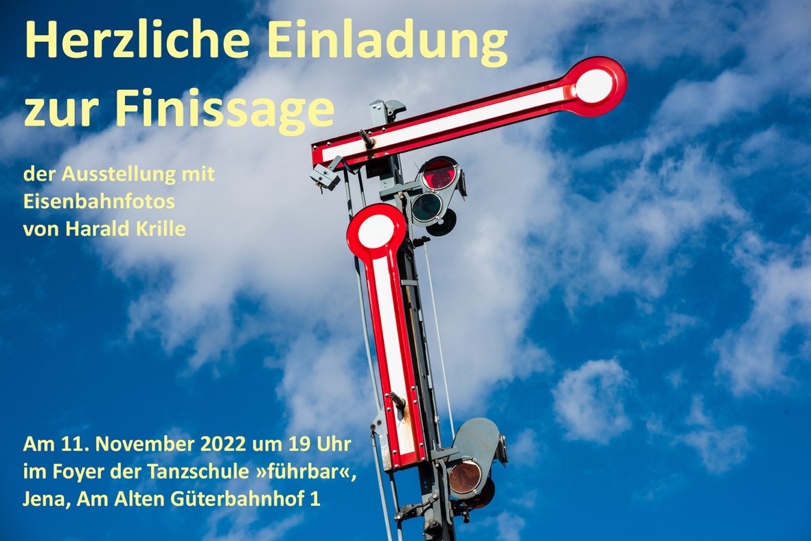 »Halt« heißt es nun auch für die kleine Fotoausstellung mit Eisenbahnbildern, die seit einem Jahr in der Tanzschule »führbar« in Jena zu sehen ist. Nachdem der Versuch einer Vernissage zweimal durch Corona vereitelt wurde, wollen wir jetzt wenigstens zum Abschluss am Freitag, den 11. November, noch einmal die Gelegenheit suchen, mit einem Glas Sekt oder Selters in der Hand die Bilder zu betrachten und miteinander ins Gespräch zu kommen. Es besteht natürlich auch die Gelegenheit, meinen druckfrischen Eisenbahnkalender für 2023 (oder auch eines der ausgestellten Bilder) zu erwerben.